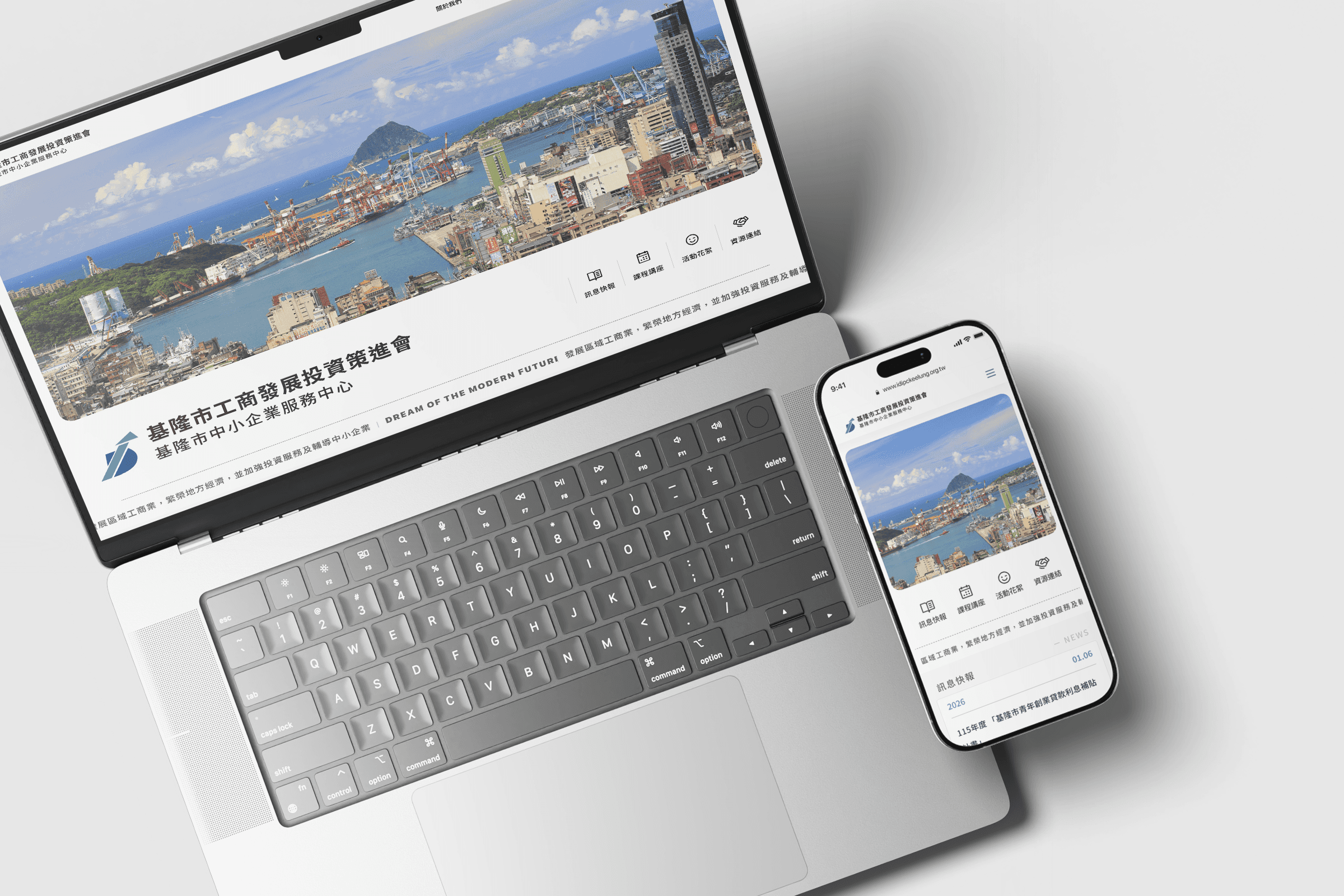 本專案為基隆市工商發展投資策進會形象官網設計,以「基隆資訊中心」為核心概念,透過理性秩序的版面結構與具指標性的主視覺,傳達作為產業樞紐與資訊集散地的角色。